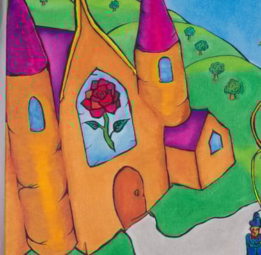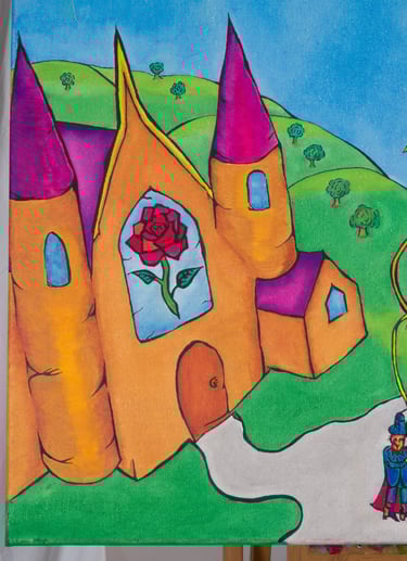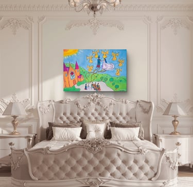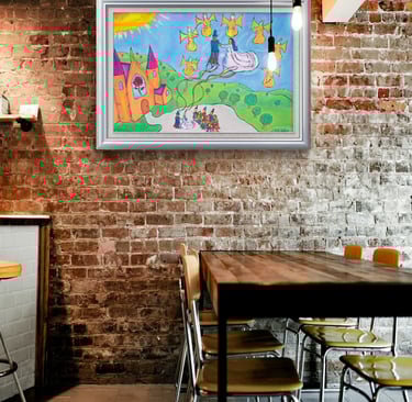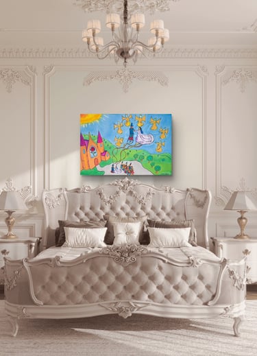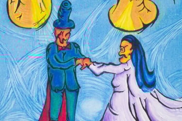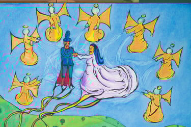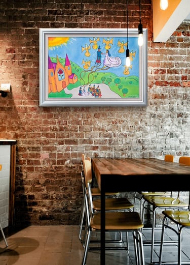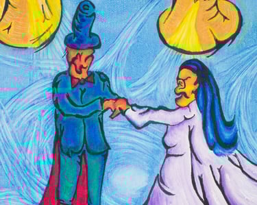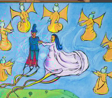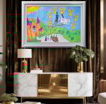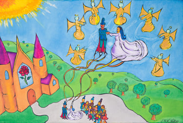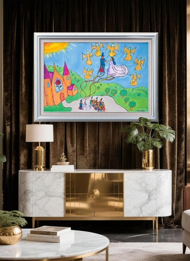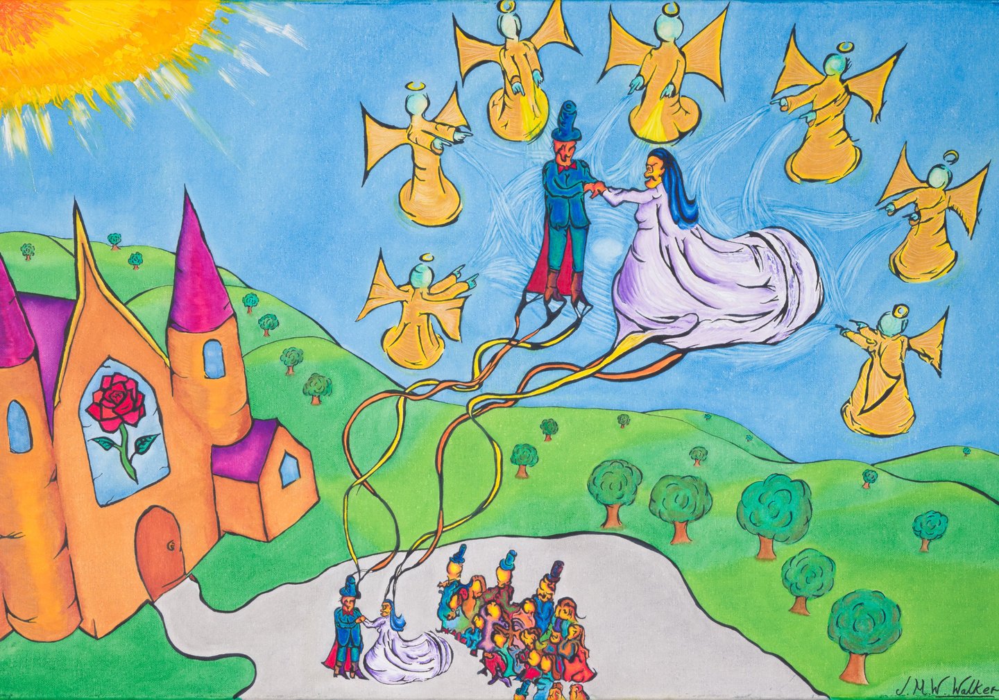 This piece is called ‘A Heavenly Gander’, displaying a newly married couple being celebrated by family and friends -but although physically present, existentially the couple are the only two to draw breath in the moment, floating on a cloud of love rendered poignantly by Golden Angels. These celestial beings are the providers of enlightenment, higher consciousness and divine power. After all, is there anything more divine and powerful as love?