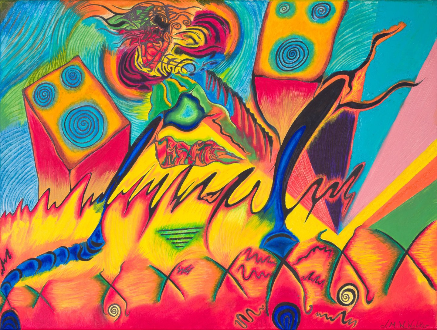An entity controlling the music, a sound-clash controlling the crowd. Incorporating layers of beats, tempo and aura, the vibrancy and blending of the bright colours amplify the noise created within