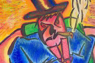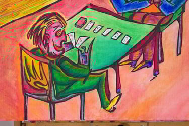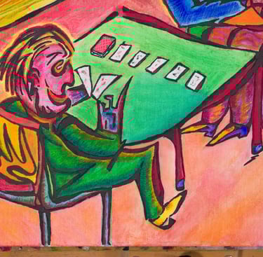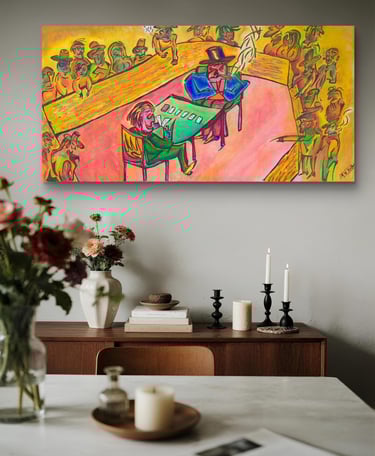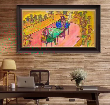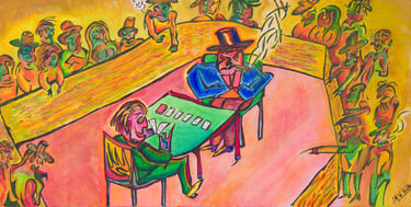 Set in the gloomy atmosphere of a high stakes poker game, this piece portrays the formidably thoughtful, tactical, deceiving and downright cunning motions adversaries adopt in order to win. What body language and mannerisms do you use in life to portray that of the winning hand? The mannerisms shown in this piece could be that of the blagger, one who fools with no realistic hope of succeeding, yet still can succeed through using their ‘nous’. Or could it be that of the double bluff? A player who shows themselves to be vulnerable and disconcertingly weak, yet plays the ultimate underhanded deed? Mannerisms shown could also include that of coldness, stern and without falter in the position of question - But couldn’t the poised façade be the biggest blag of all? Only one way to find out - play out the hand you have and see who’s blagging.