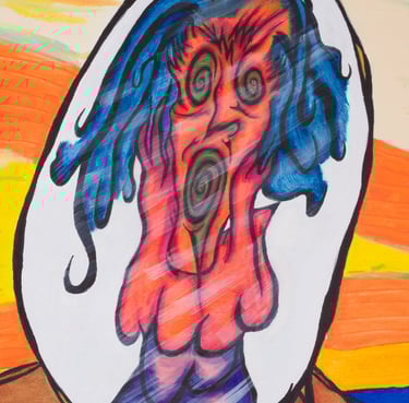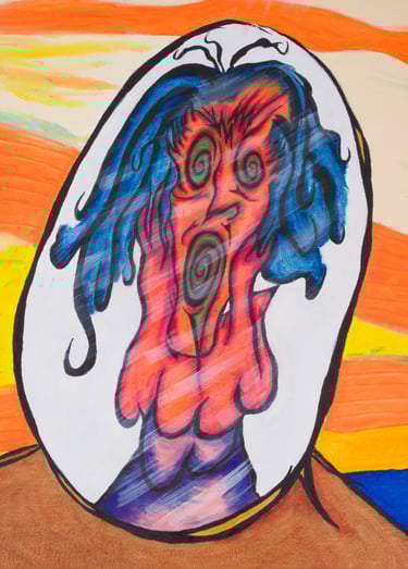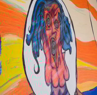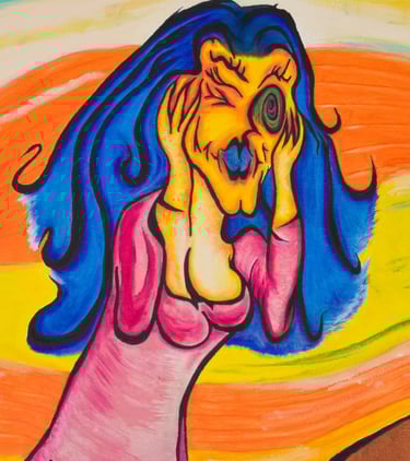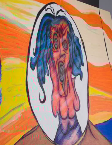 Paying homage to the late, great Edvard Munch, this piece portrays a similar concept and colour scheme as Munch’s ‘The Scream’. This piece is called ‘A Screaming Façade’, exploring the pain of inner turmoil, the inability to self relate and display trueness: Overcoming external suppression from society to be yourself!